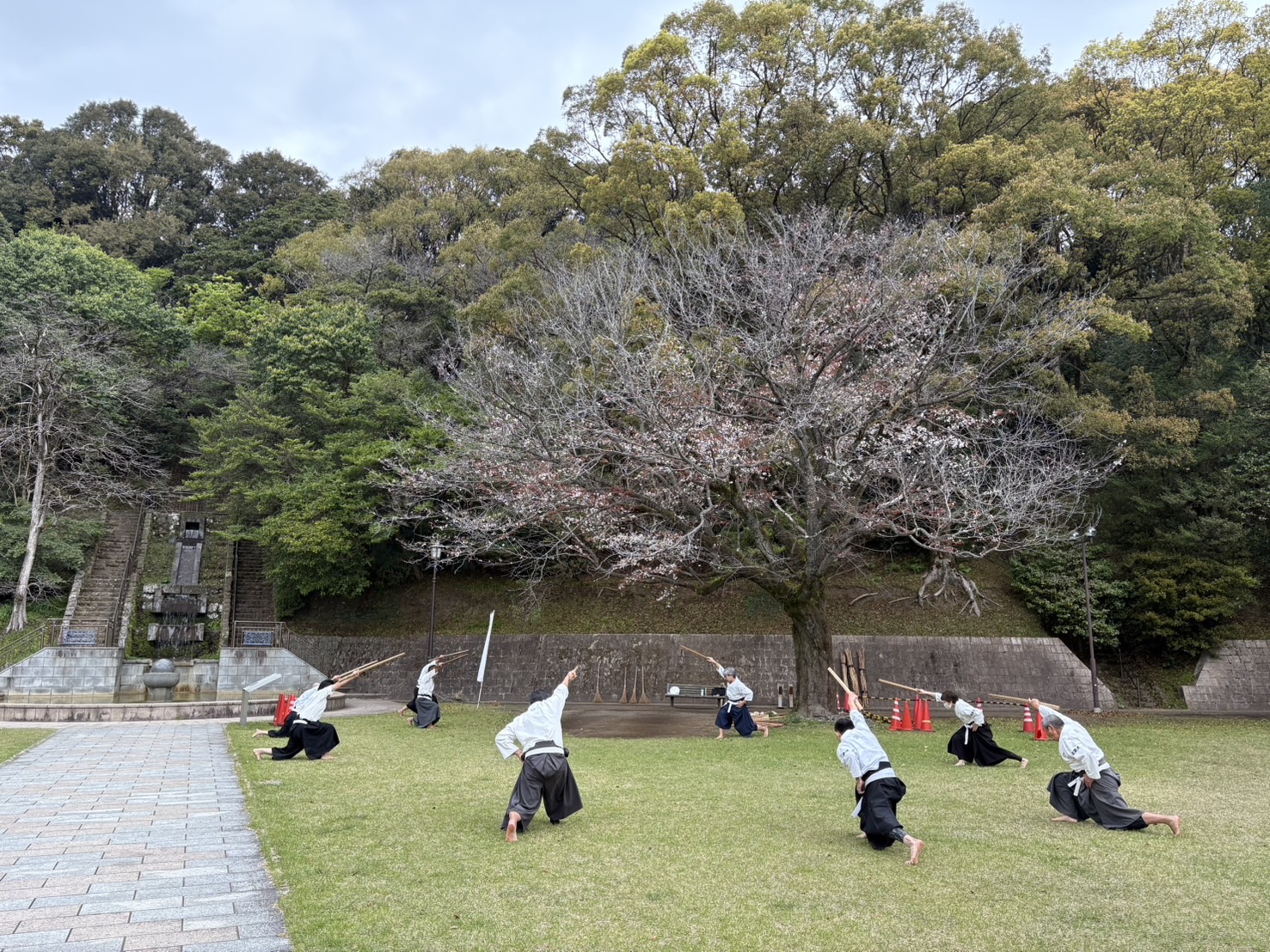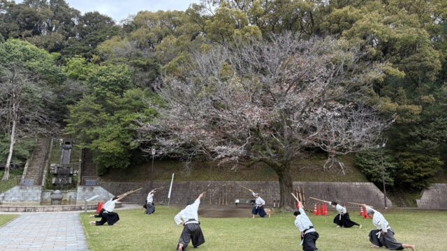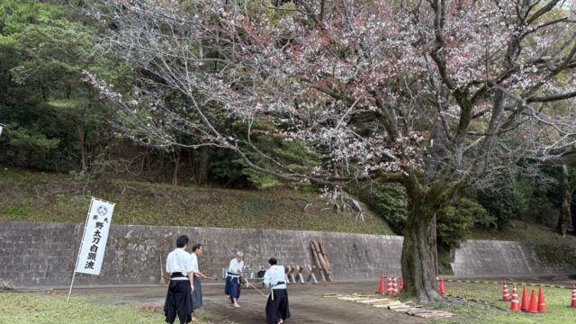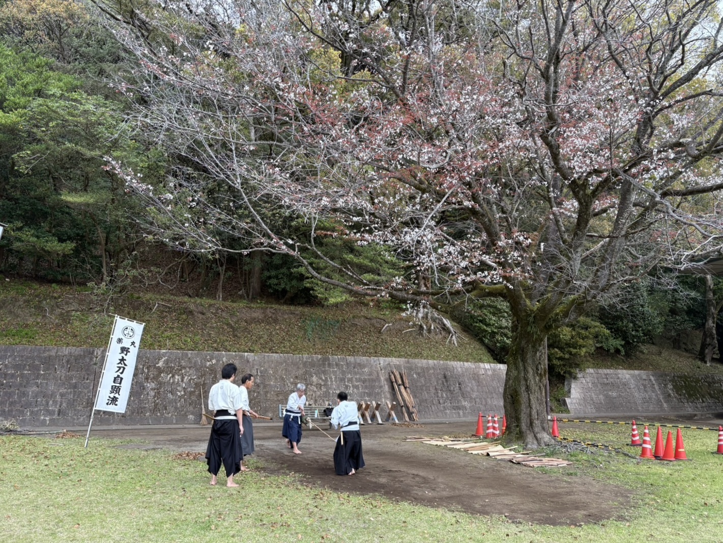 活動の風景 【谷山道場】道場の桜 jigenryuhozonkai 2026年3月23日 雨が降り始めのようなスッキリしない天気でしたが、いつもの大きな桜の木の側で定例稽古でした。開花予想では来週満開のようですが、谷山道場の老木は気が早いのか既に咲いた花が散り始めていました。 毎年この時期に桜吹雪が舞う中で稽古をするのは本当に気持ちが良いです。歳をとって段々と咲く花が少なくなってきた道場の桜ですが、いつまでも頑張って咲いて欲しいものです。